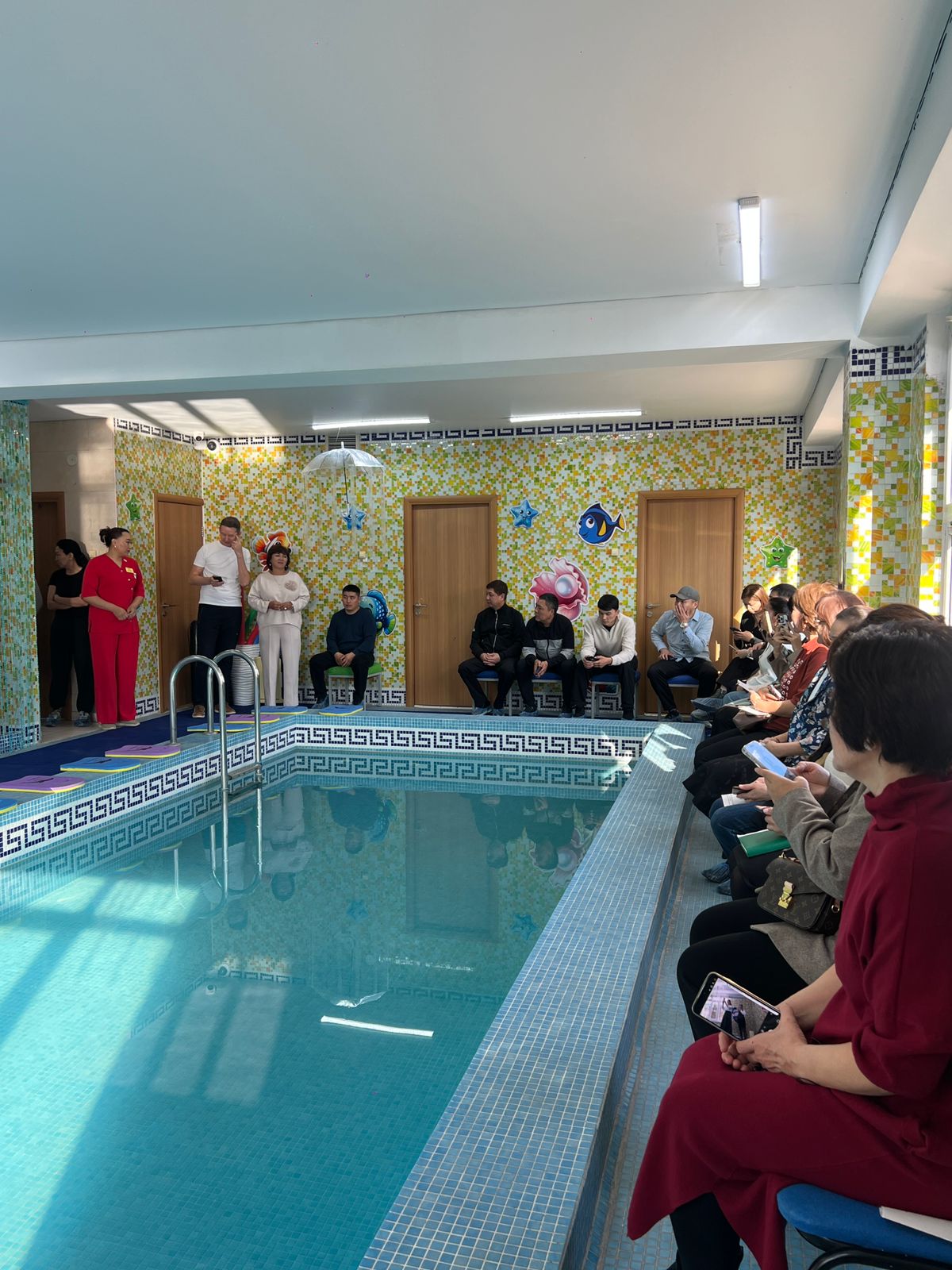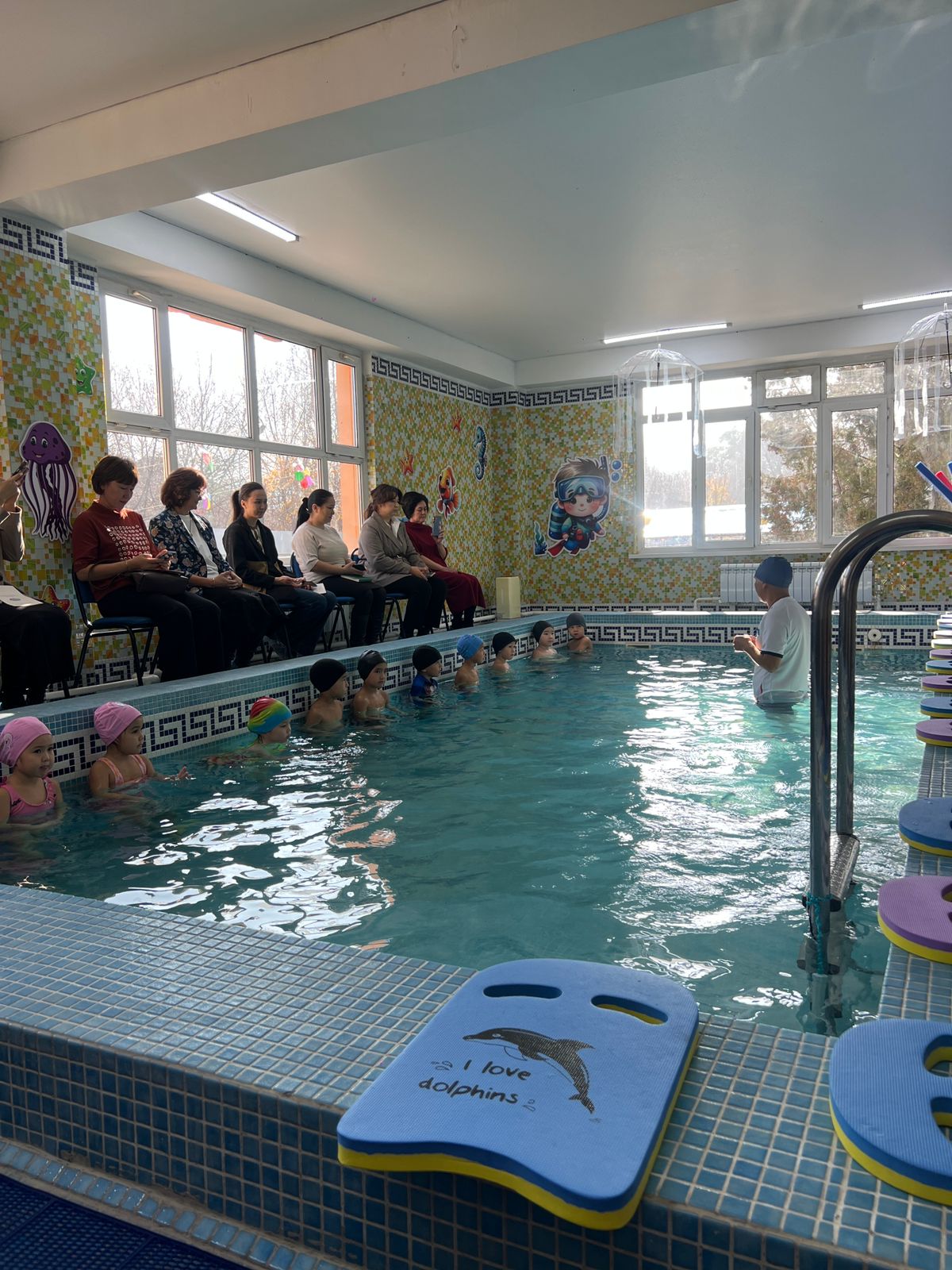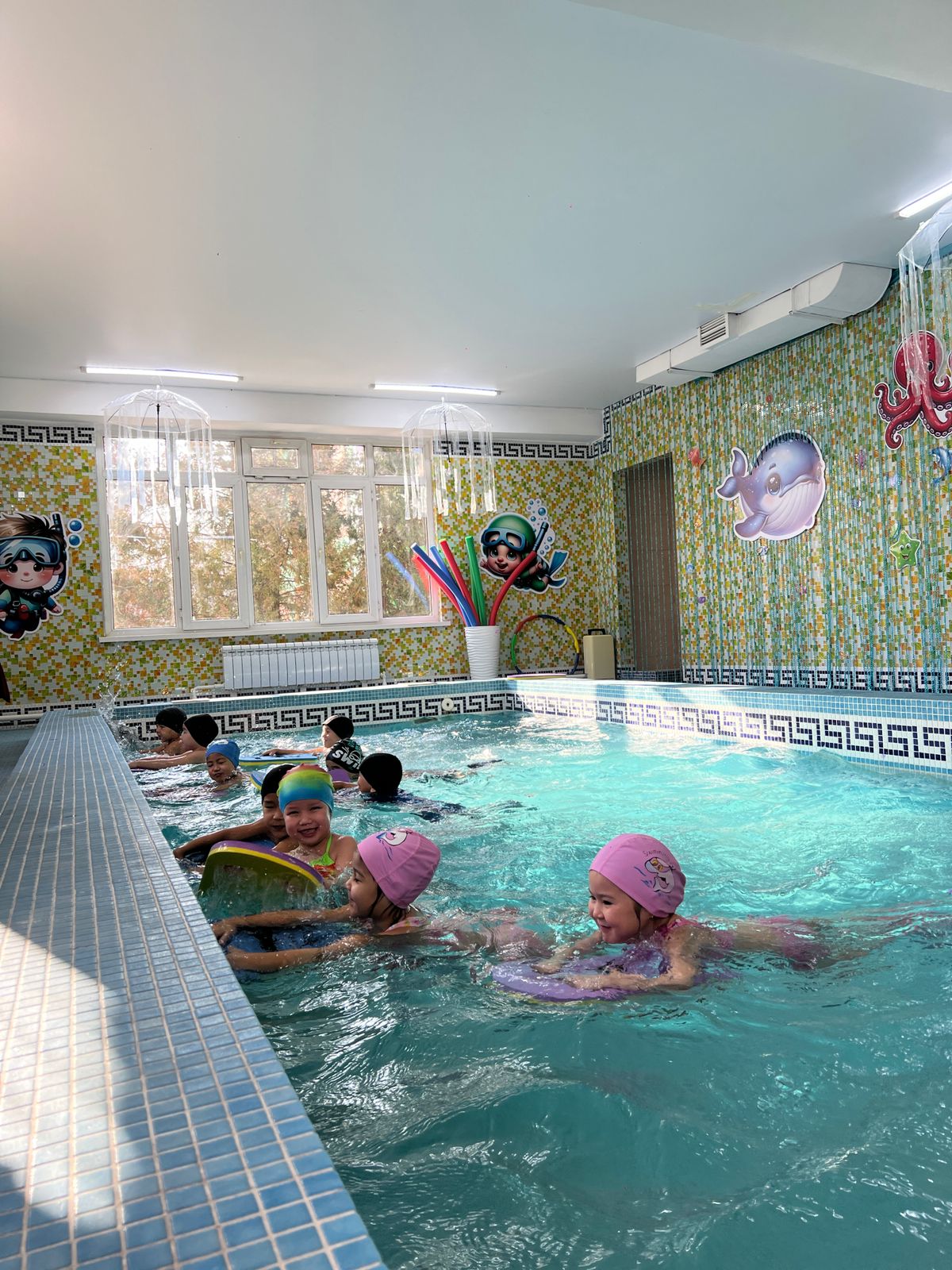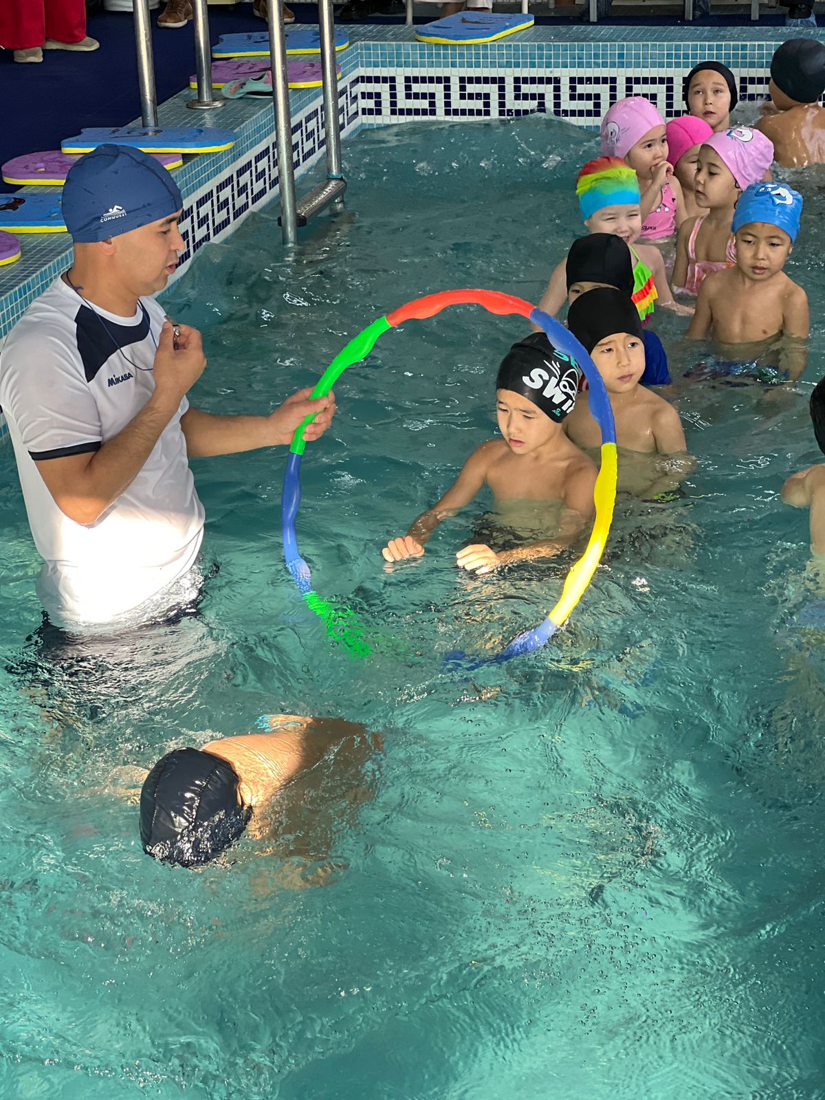 💧 Бассейнде: балалар жүзу дағдыларын көрсетіп, судың денсаулыққа пайдасы таныстырылды.