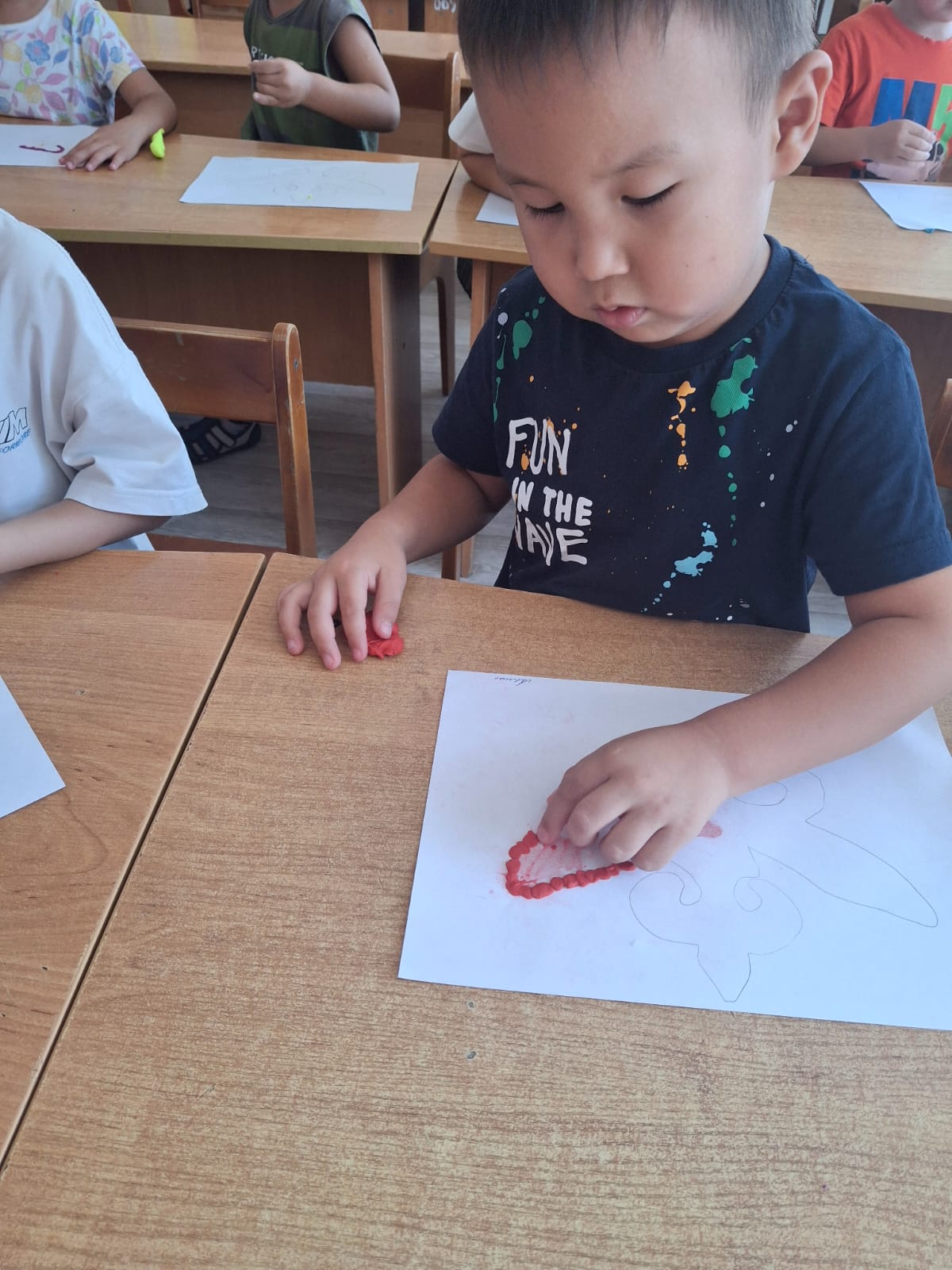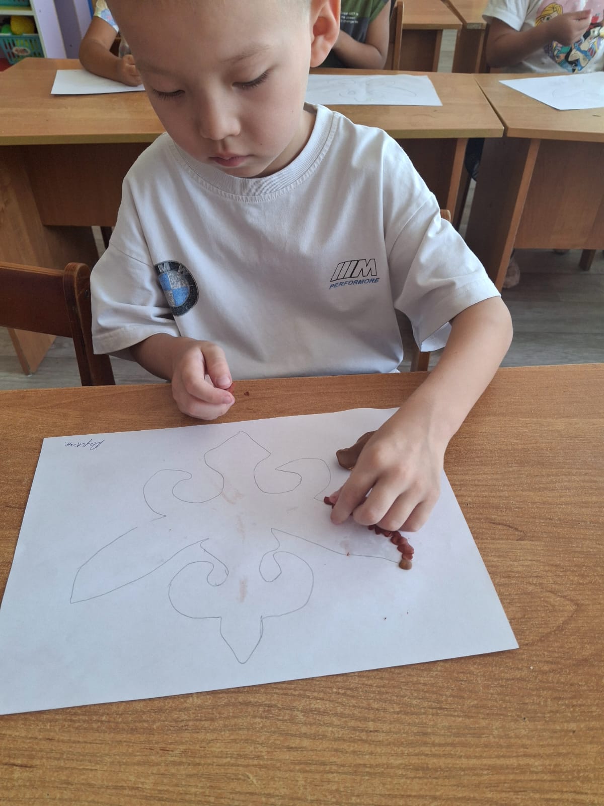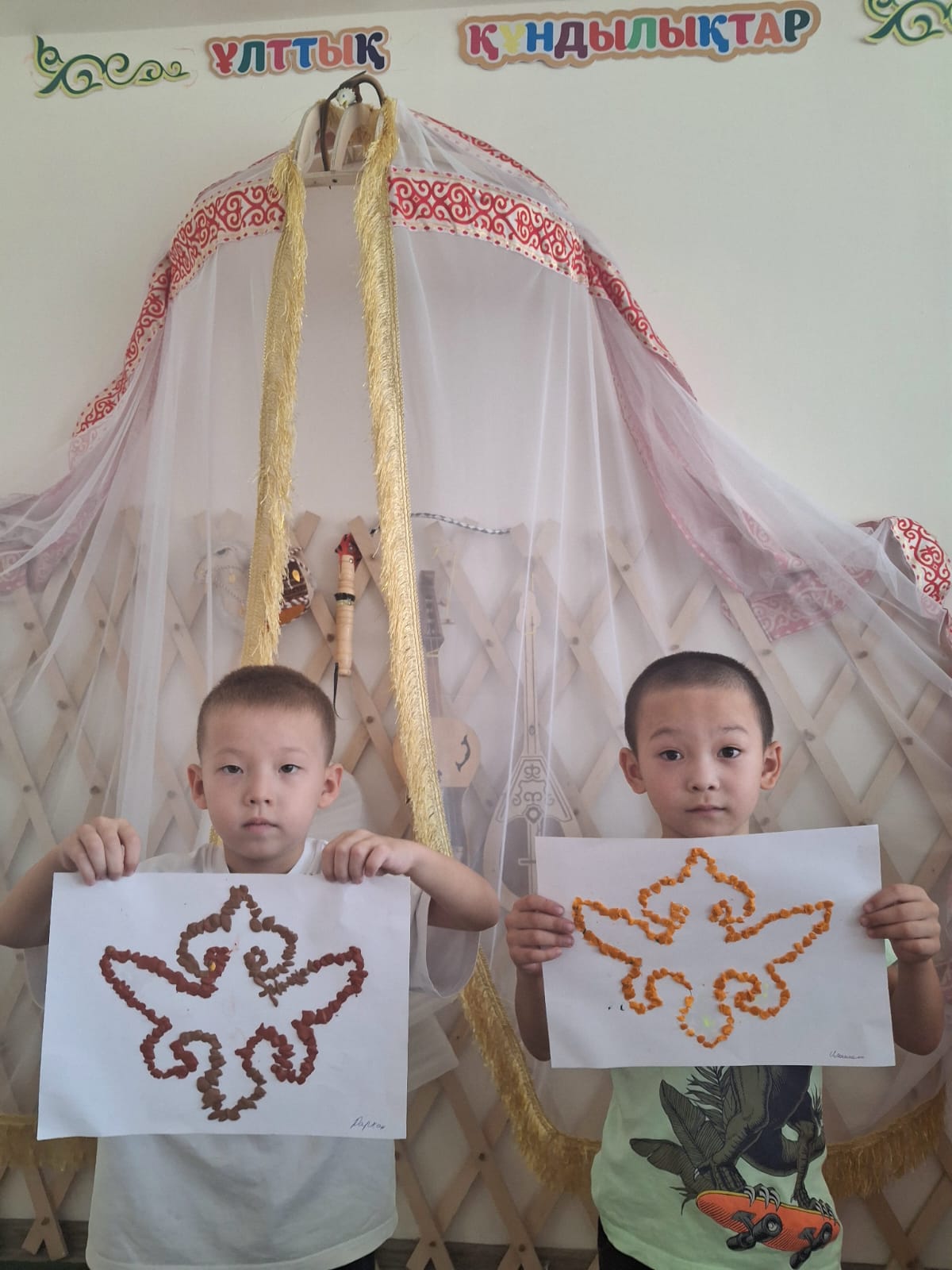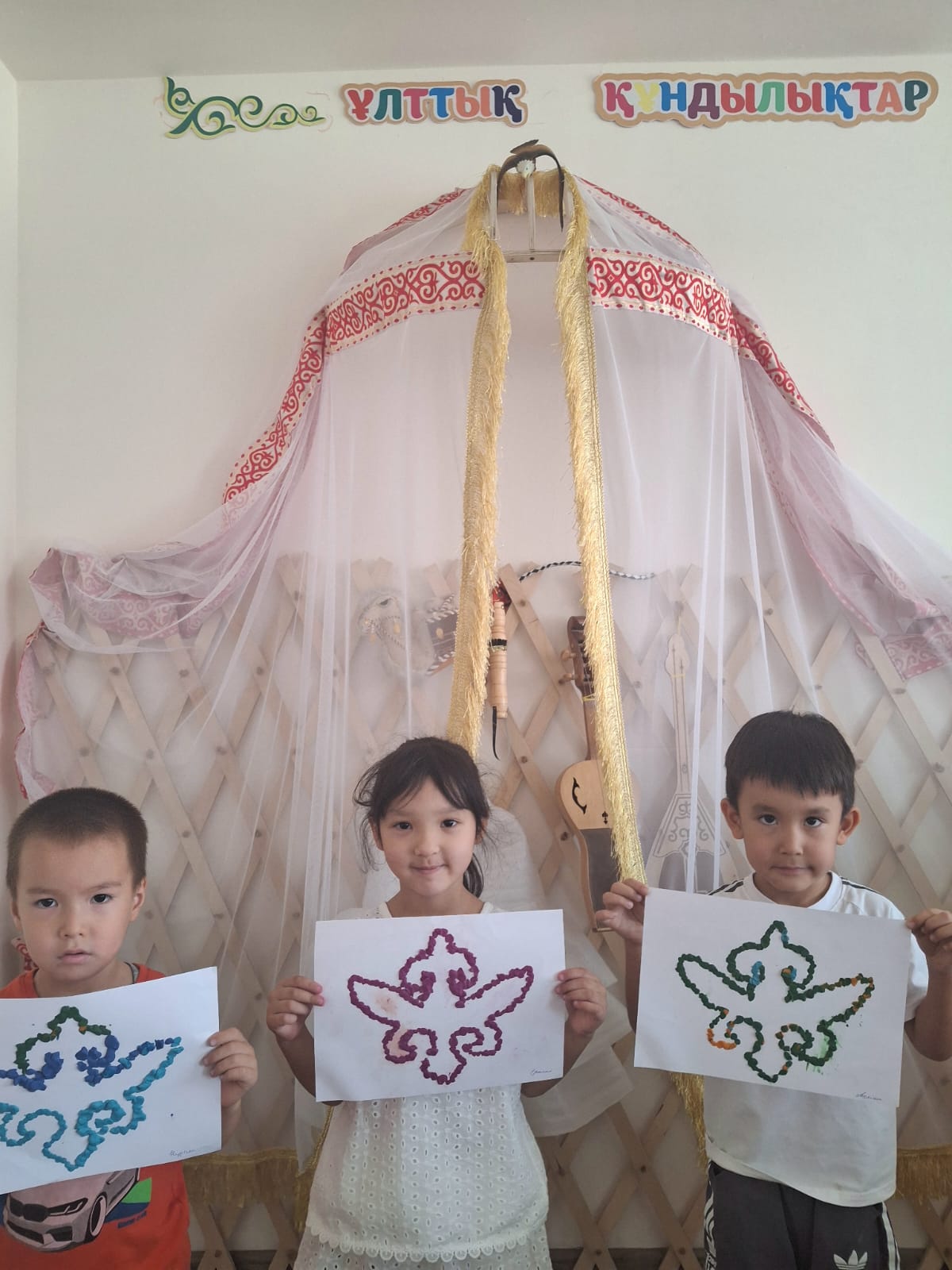 Мақсаты: Туған халқының мәдени мұрасымен, сәндік қолданбалы өнерінің түрлерімен таныстыру. Әсемдікті сезіну ою-өрнекті құрылым жасай отырып қол моторикасын дамыту.